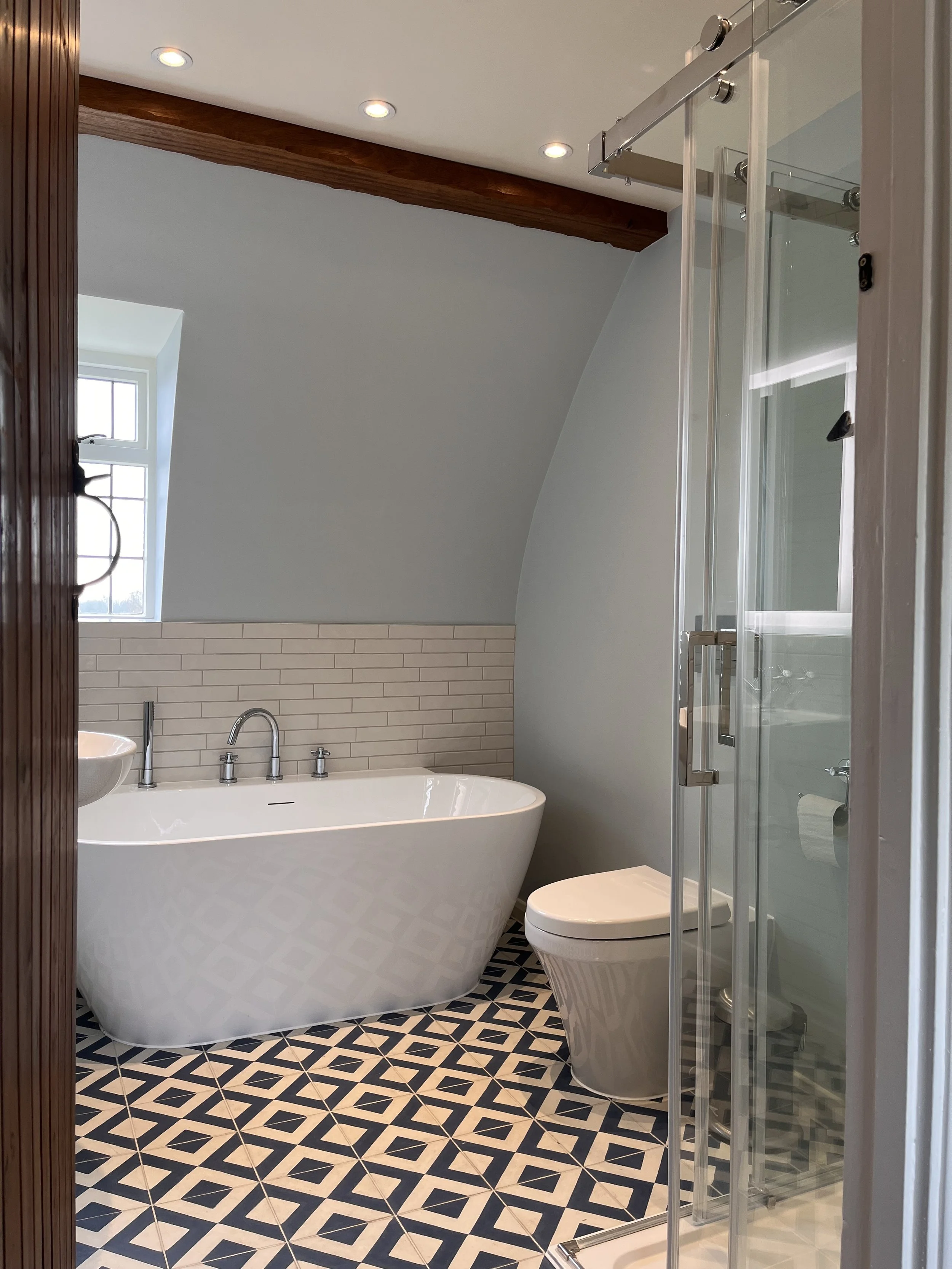 The owners of this Grade II listed cottage in Bury Green are renovating each room with great care. The brief was to come up with a more contemporary look without compromising any of the cottage’s character features. The design choices for this home have to take account of the needs of a busy family with two young children so I researched quality products and furniture that would withstand some rough and tumble and would grow with the family. The images here show the family bathroom and ensuite. More images to follow …
